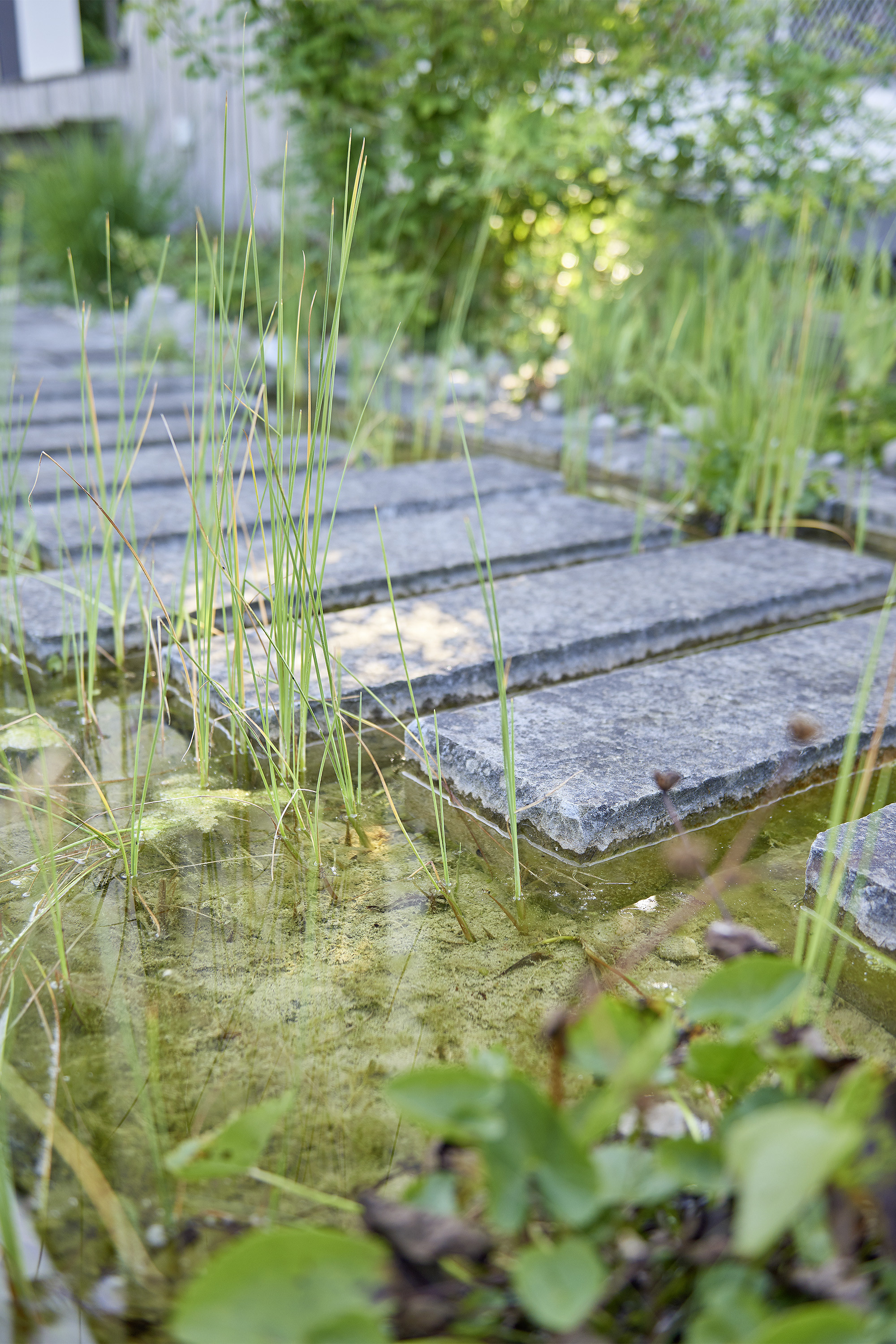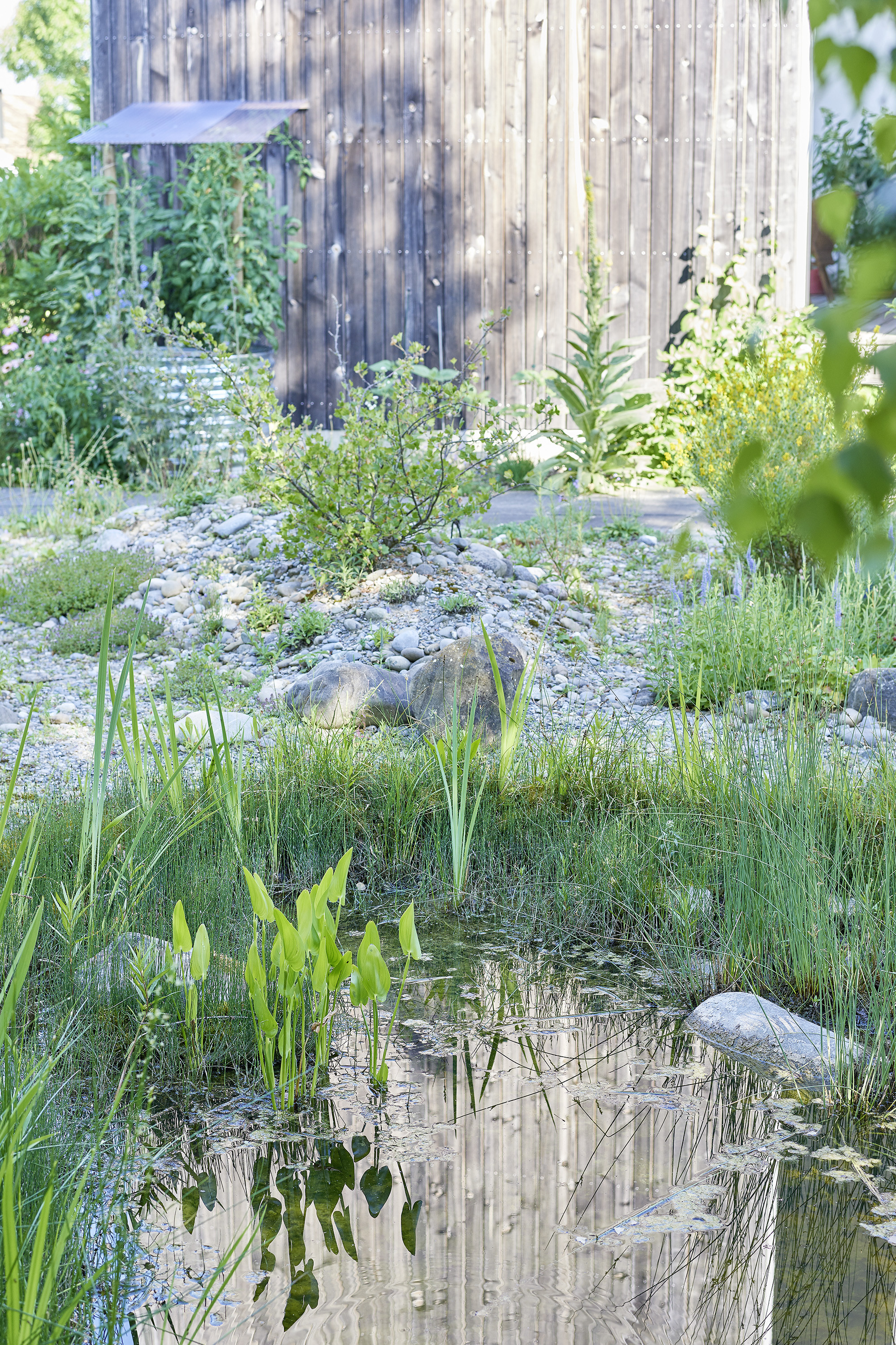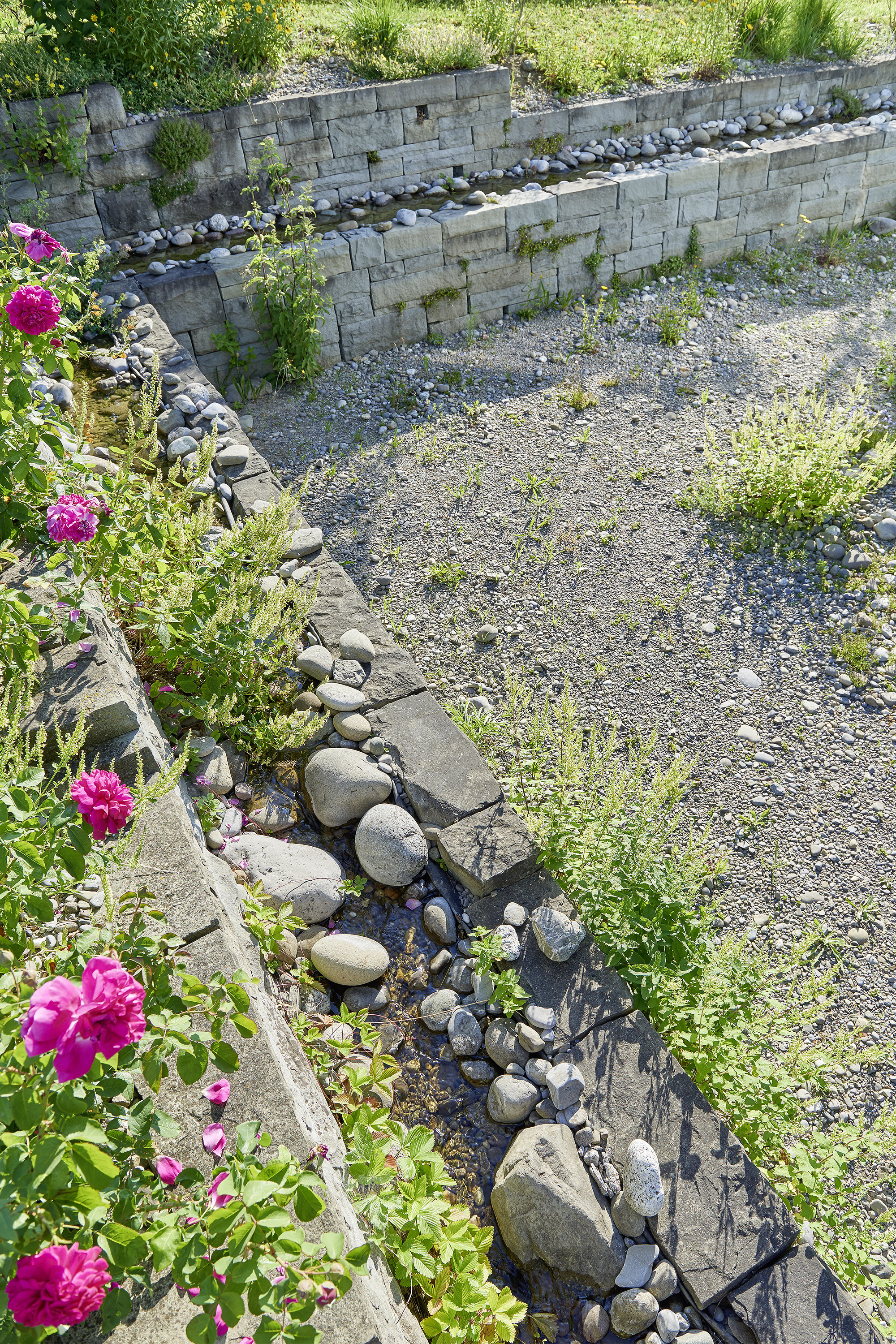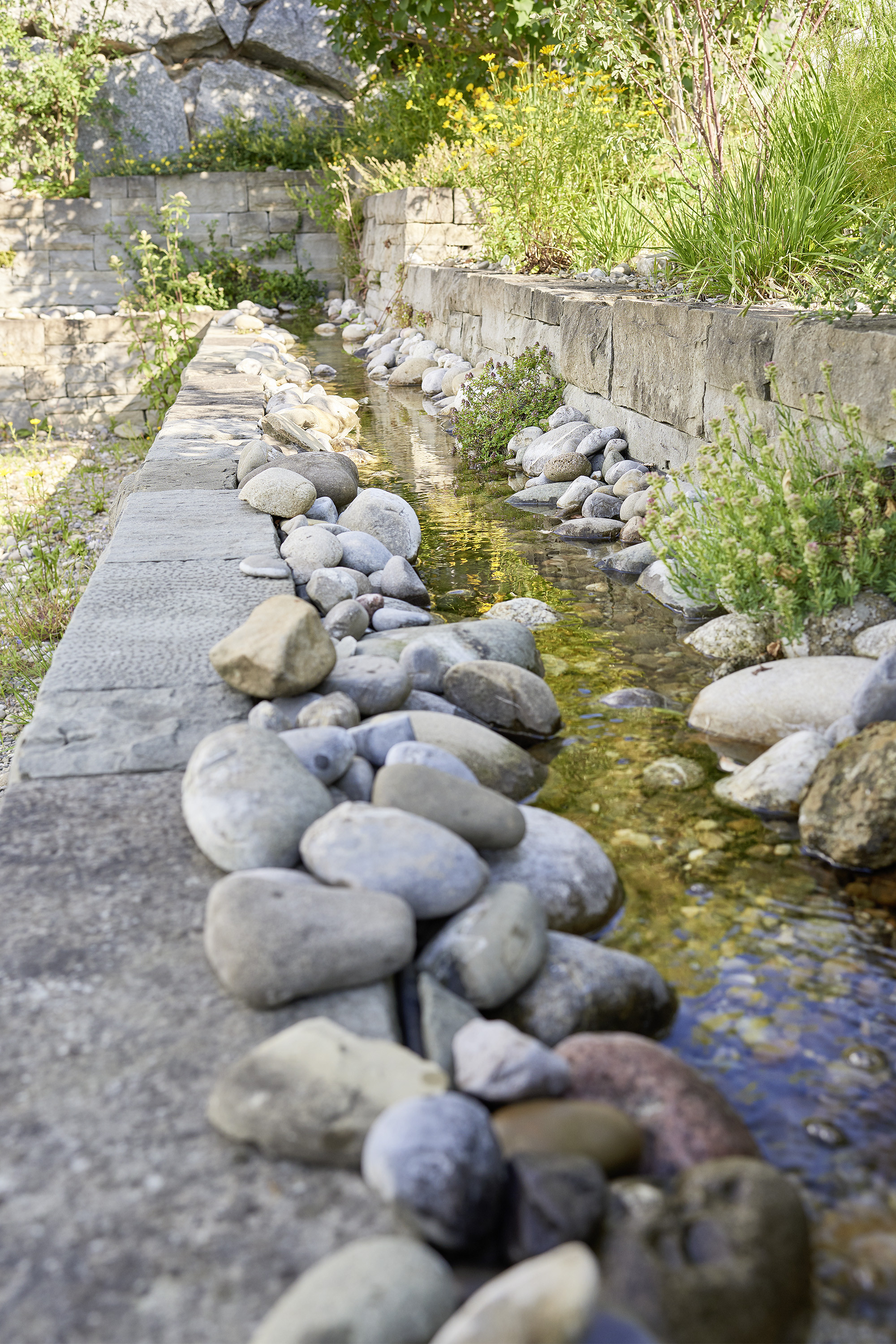 Die Gebäudearchitektur in kubischer Klarheit wird von der linearen Führung von Trockenmauern und Bachlauf mit Flachwasserbecken unterstrichen. Die üppige Wildheit des Flors besänftigt die Strenge baulicher Elemente.