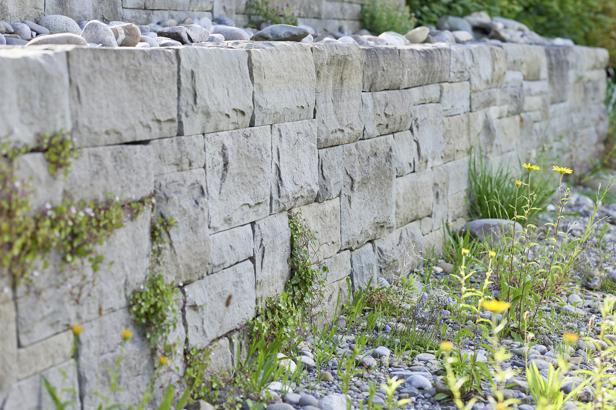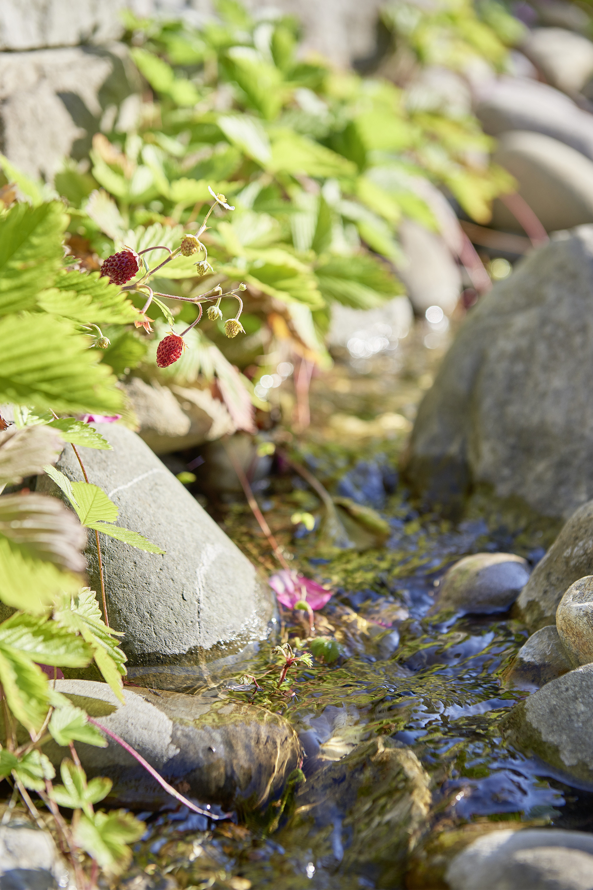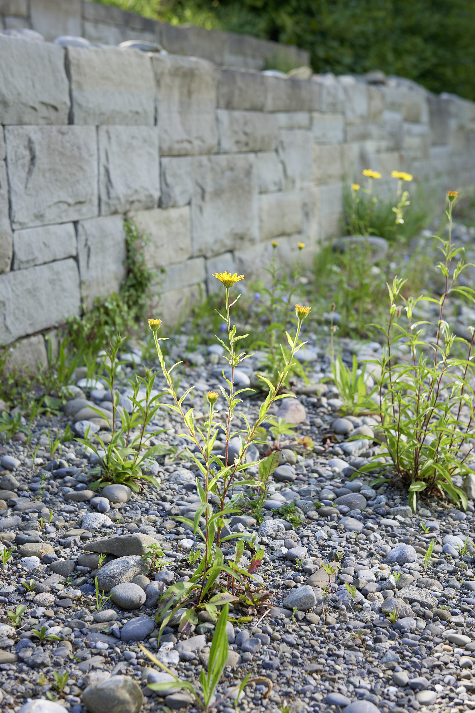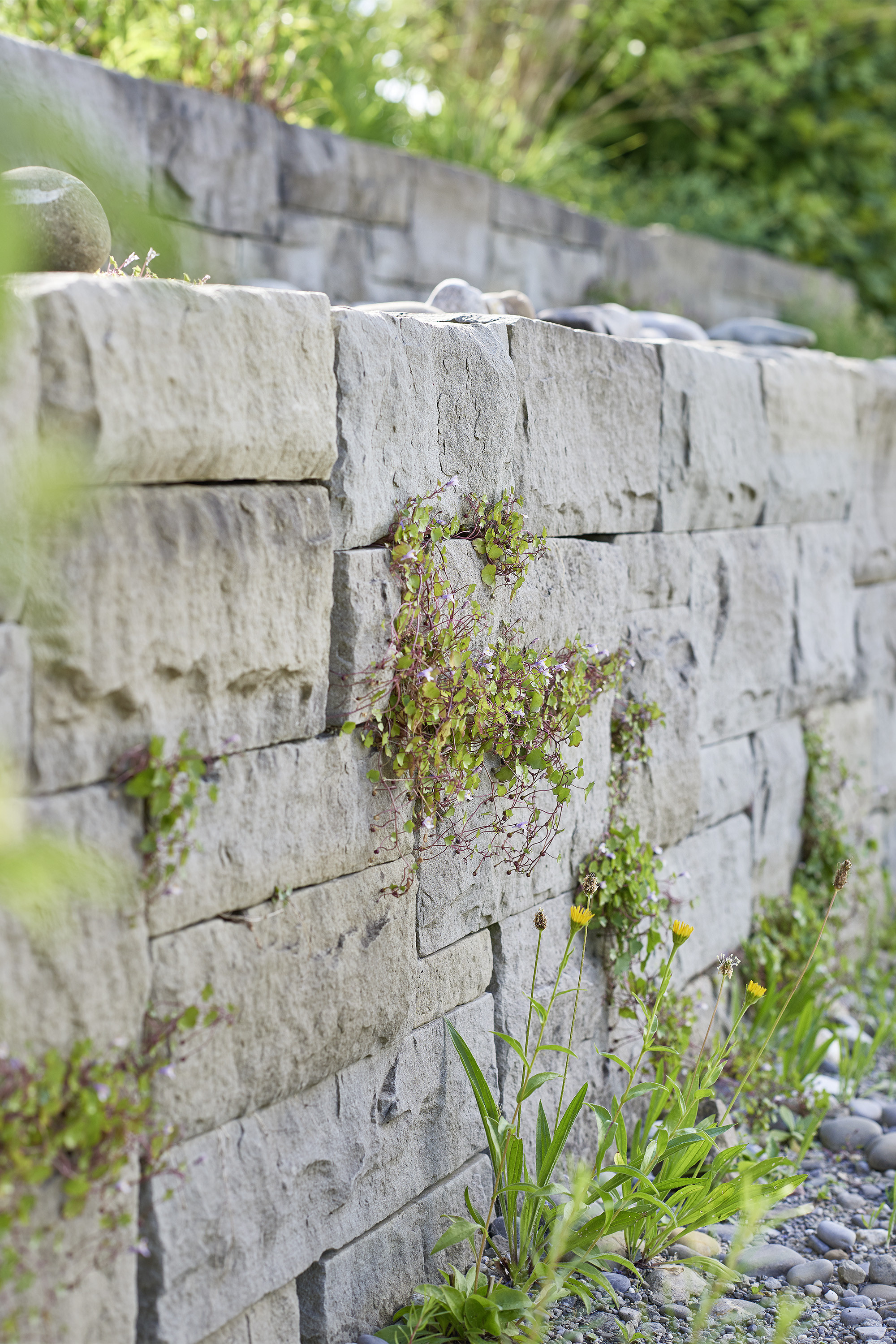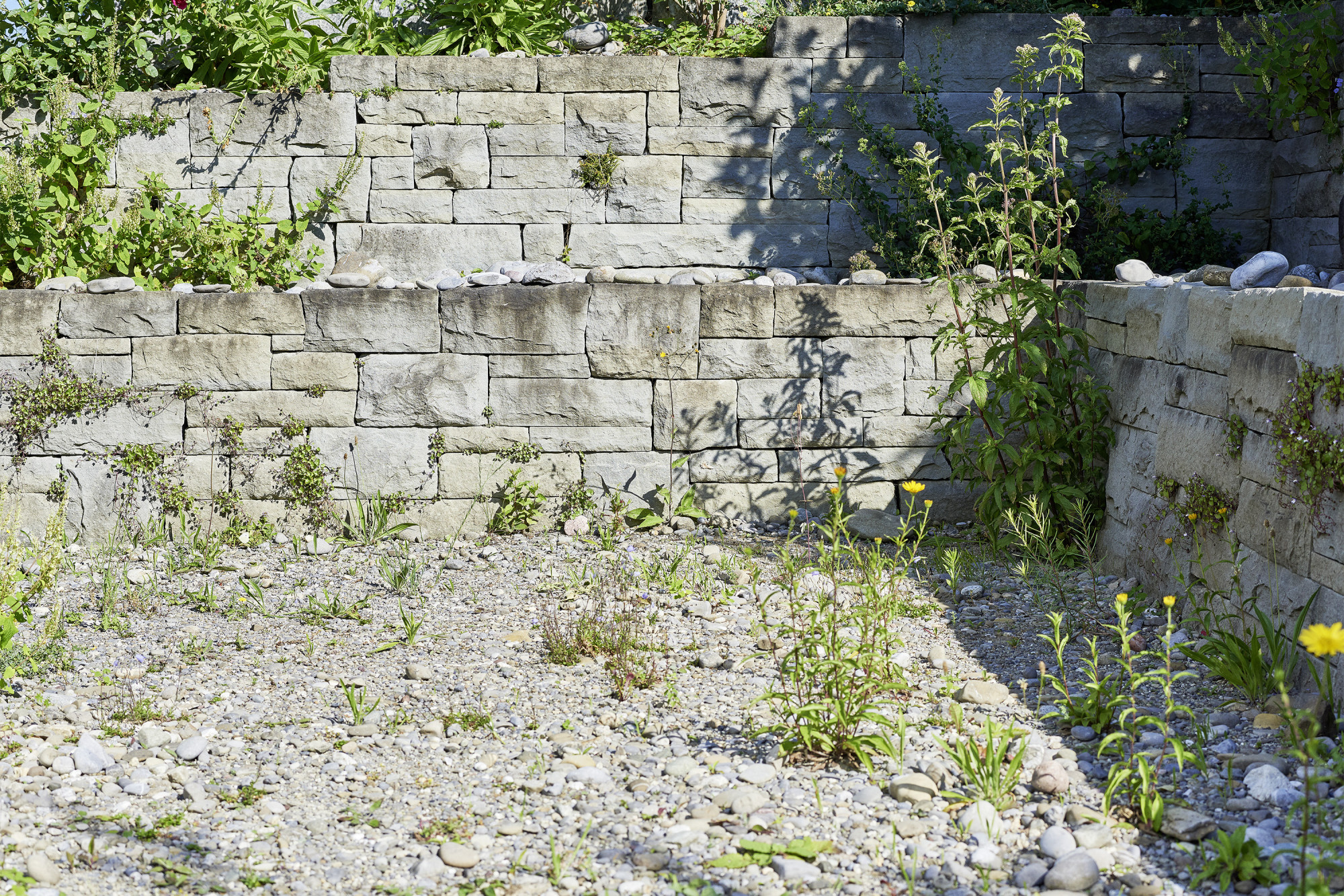 Die Gebäudearchitektur in kubischer Klarheit wird von der linearen Führung von Trockenmauern und Bachlauf mit Flachwasserbecken unterstrichen. Die üppige Wildheit des Flors besänftigt die Strenge baulicher Elemente.